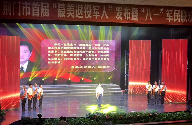7月29日,“八一”建軍節(jié)前夕,荊門市首屆“最美退役軍人”發(fā)布儀式暨慶“八一”軍民聯(lián)歡演出在荊門劇院隆重舉行。此次全市“最美退役軍人”評選,經(jīng)網(wǎng)絡(luò)投票、意見征求和綜合審核等環(huán)節(jié)層層篩選,最終湖北荊門建工集團有限公司陳國新等來自全市各自崗位的20名優(yōu)秀退役軍人脫穎而出榮獲“最美退役軍人”稱號。