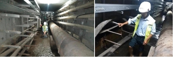 在泉口綜合管廊第六分區(qū),巡查人員發(fā)現(xiàn)排水泵故障,積水不斷上漲,公司立即安排人員進行設備搶修,抽排積水。在仙楊路綜合管廊下穿河道處,因避讓河道,此處管廊呈“凹”字型,管廊內(nèi)部積水嚴重,公司組織人員架設臨時排水泵進行抽排,經(jīng)過5小時緊急搶險,消除了安全隱患。