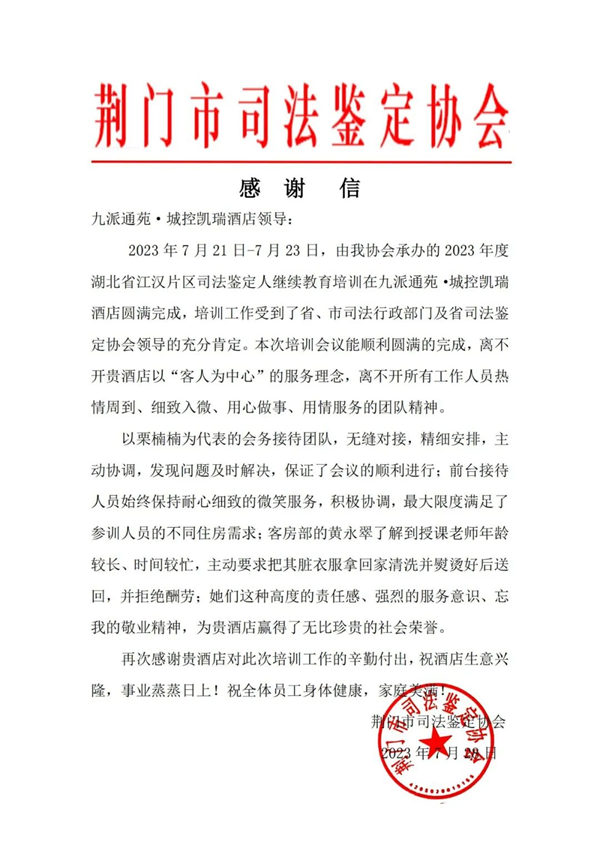 “培訓(xùn)工作期間,貴賓館支持我協(xié)會出色完成了會務(wù)接待工作,對2023年度湖北省江漢片區(qū)司法鑒定人繼續(xù)教育培訓(xùn)成功舉辦做出了積極貢獻。在此,謹向貴賓館表示衷心的感謝和崇高的敬意!”7月28日,荊門市司法鑒定協(xié)會向荊門九派通苑?城控凱瑞酒店發(fā)來感謝信,就酒店在培訓(xùn)會期間的接待表現(xiàn)予以高度肯定。