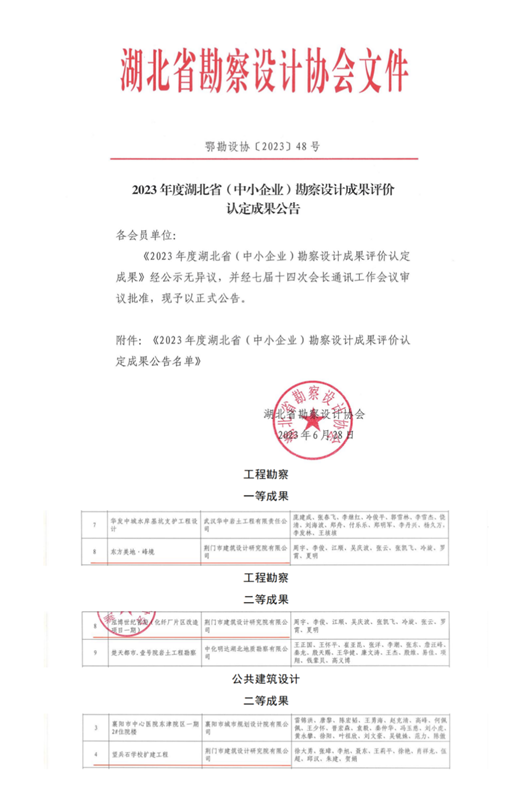 近日,湖北省勘察設(shè)計協(xié)會公布《2023年度湖北?。ㄖ行∑髽I(yè))勘察設(shè)計成果評價認定成果公告》。市建筑設(shè)計研究院完成的東方美地?峰境勘察項目榮獲湖北省工程勘察一等成果獎項;泓博世紀首府(化纖廠片區(qū)改造項目一期)勘察項目榮獲湖北省工程勘察二等成果獎項;望兵石學(xué)校擴建工程設(shè)計項目榮獲湖北省公共建筑設(shè)計二等成果獎項。