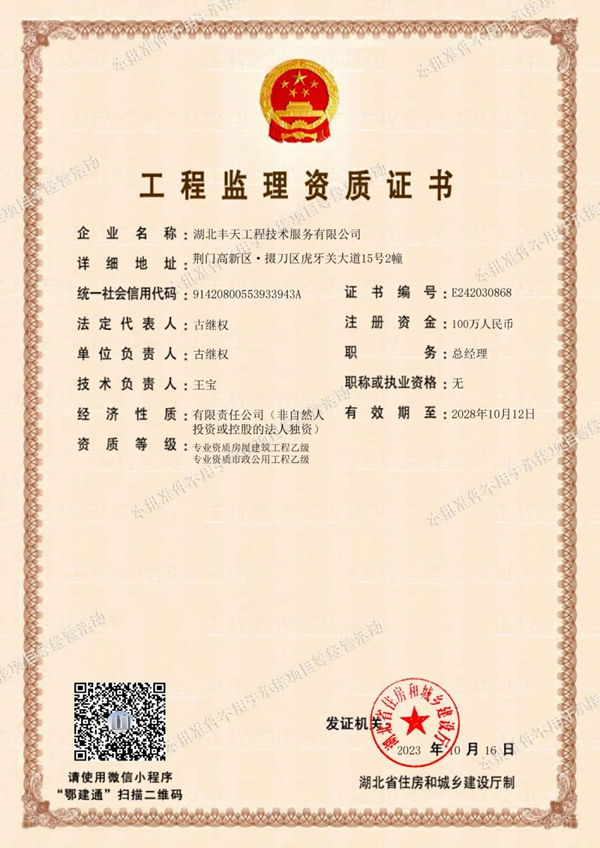 喜報!湖北豐天公司喜獲工程監(jiān)理資質(zhì)