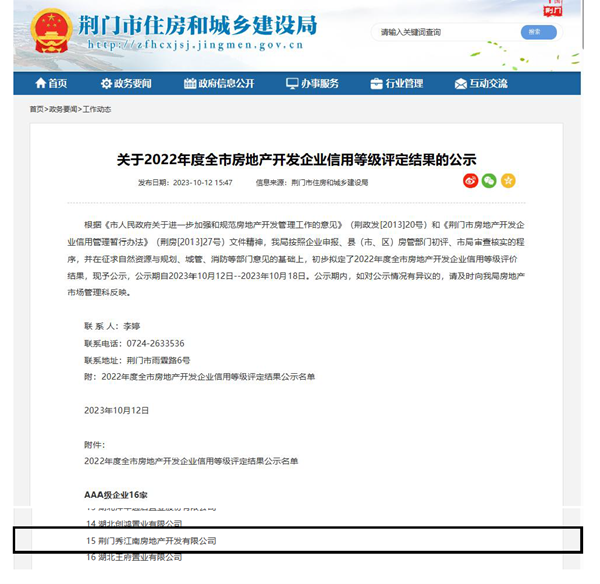 近日,市住建局公示了2022年度全市房地產(chǎn)開發(fā)企業(yè)信用等級(jí)評(píng)定結(jié)果,荊門城建集團(tuán)所屬秀江南公司榮獲AAA級(jí)信用等級(jí)評(píng)定。AAA級(jí)信用評(píng)定是對(duì)企業(yè)在開發(fā)建設(shè)、合同履約、產(chǎn)品質(zhì)量、合法經(jīng)營、社會(huì)責(zé)任等信用方面給予的最高評(píng)價(jià)。