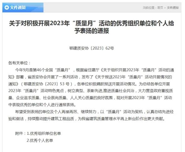 近日,湖北省建設(shè)工程質(zhì)量安全協(xié)會(huì)發(fā)布《關(guān)于對(duì)積極開(kāi)展2023年質(zhì)量月活動(dòng)優(yōu)秀組織單位和個(gè)人給予表?yè)P(yáng)的通報(bào)》,中房集團(tuán)荊門公司所屬金茂建設(shè)公司位列其中,獲評(píng)“優(yōu)秀組織單位”,該公司郭家松、王建軍、徐爽三名同志榮獲“優(yōu)秀個(gè)人”。