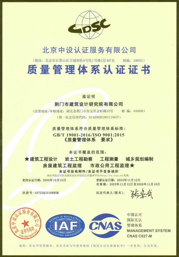 近日,北京中設(shè)認(rèn)證服務(wù)有限公司對(duì)市建筑設(shè)計(jì)研究院有限公司質(zhì)量管理體系進(jìn)行審核認(rèn)證,公司順利通過(guò)認(rèn)證并獲得證書。此次認(rèn)證是公司自2005年首次通過(guò)后,連續(xù)第18年再認(rèn)證成功。