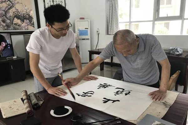 志愿者與老人交流書(shū)法,并互贈(zèng)作品