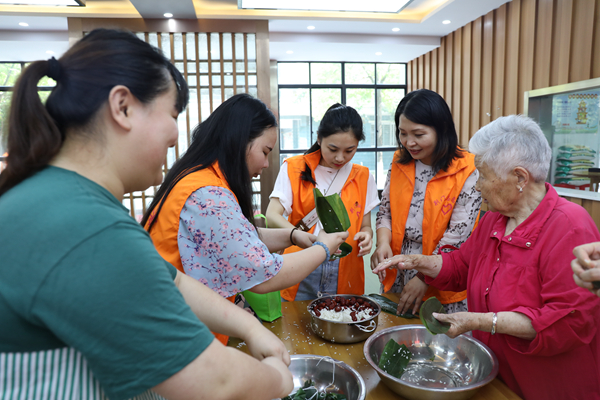 志愿者與老人一起包粽子,向老人請(qǐng)教包粽子方法,中華傳統(tǒng)文化得到傳承
