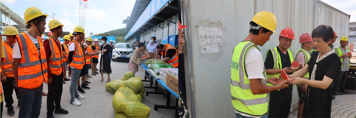魯愛群一行深入各項目建設(shè)現(xiàn)場,了解項目建設(shè)狀況,并為項目人員送去了西瓜、金銀花露等防暑物品,每到一處,魯愛群都與一線施工人員親切交談,向他們表示誠摯慰問,叮囑他們把防暑降溫放在心上,將安全規(guī)范落實到實際行動中,并要求各項目負(fù)責(zé)人合理安排作息時間,建立錯時工作制,盡可能避開高溫時段,防止高溫中暑。