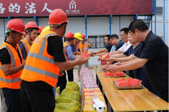 為切實(shí)做好高鐵新城片區(qū)一線工作人員的防暑降溫工作,確保施工安全,8月21日,市國資委黨委委員、副主任張斌一行深入荊門西城市綜合交通樞紐配套工程項(xiàng)目施工現(xiàn)場,開展“送清涼”慰問活動。荊門城控集團(tuán)黨委副書記張本華、工會主席肖玉蘭,荊門城建集團(tuán)相關(guān)負(fù)責(zé)人等參加活動。
